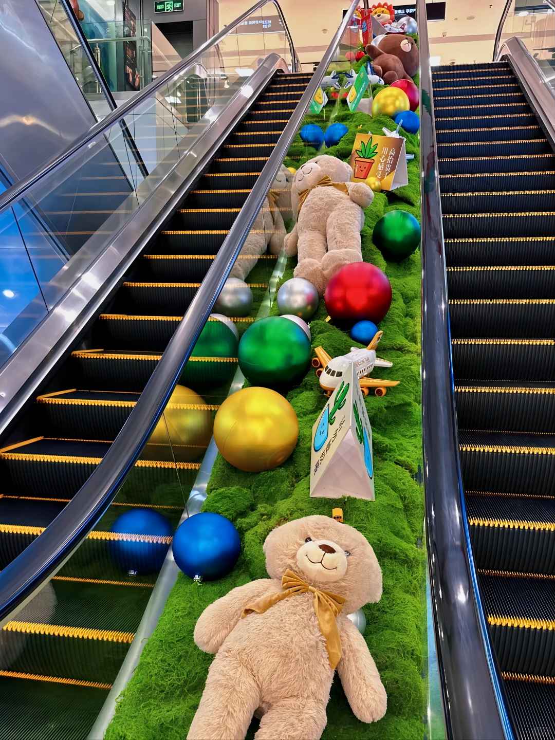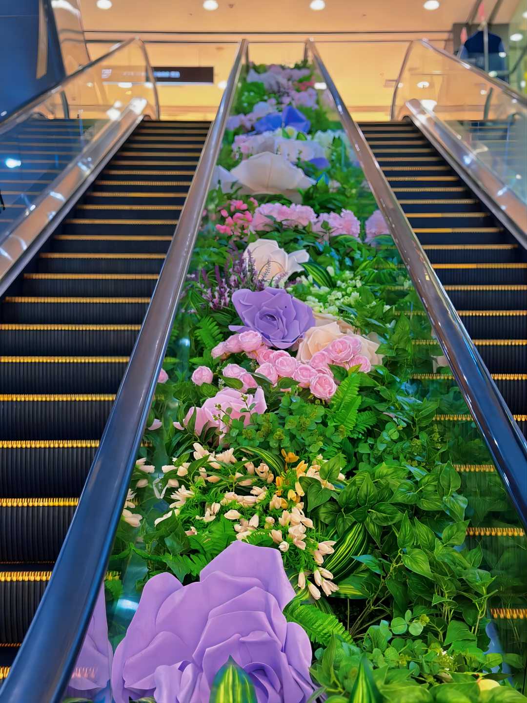 Liikkuvat kaiteet: Ostoskeskuksen liukuportaat on varustettu liikkuvilla kaiiteilla, jotka tukevat matkustajille, kun he ajavat liukuportaalla.